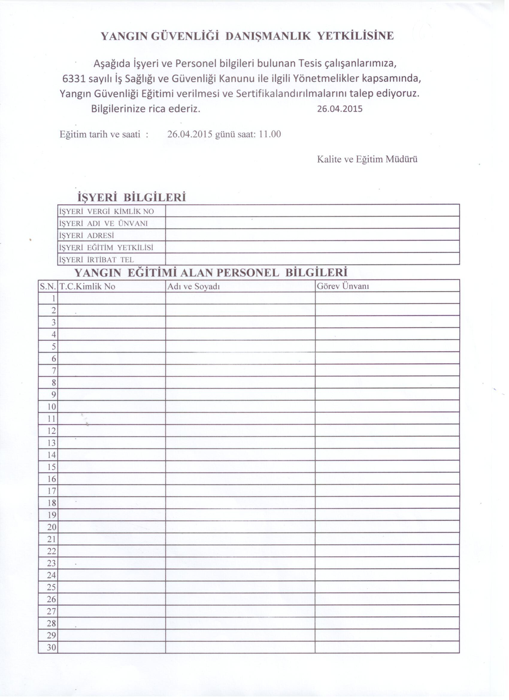 İşyeri ve Eğitim alacak Personel için, ekte sunulan İşyeri-Personel bilgi Formunu doldurmaları ve