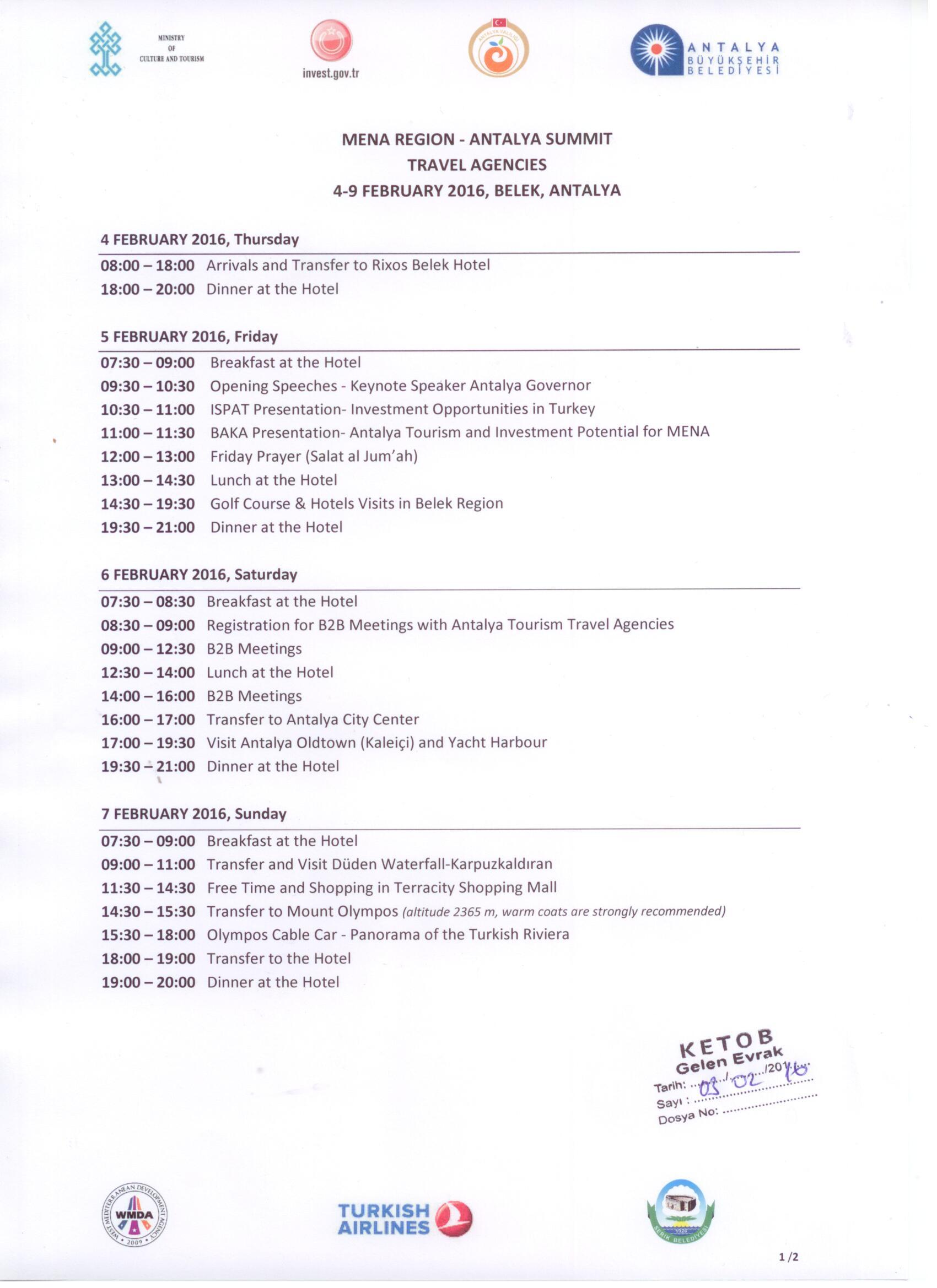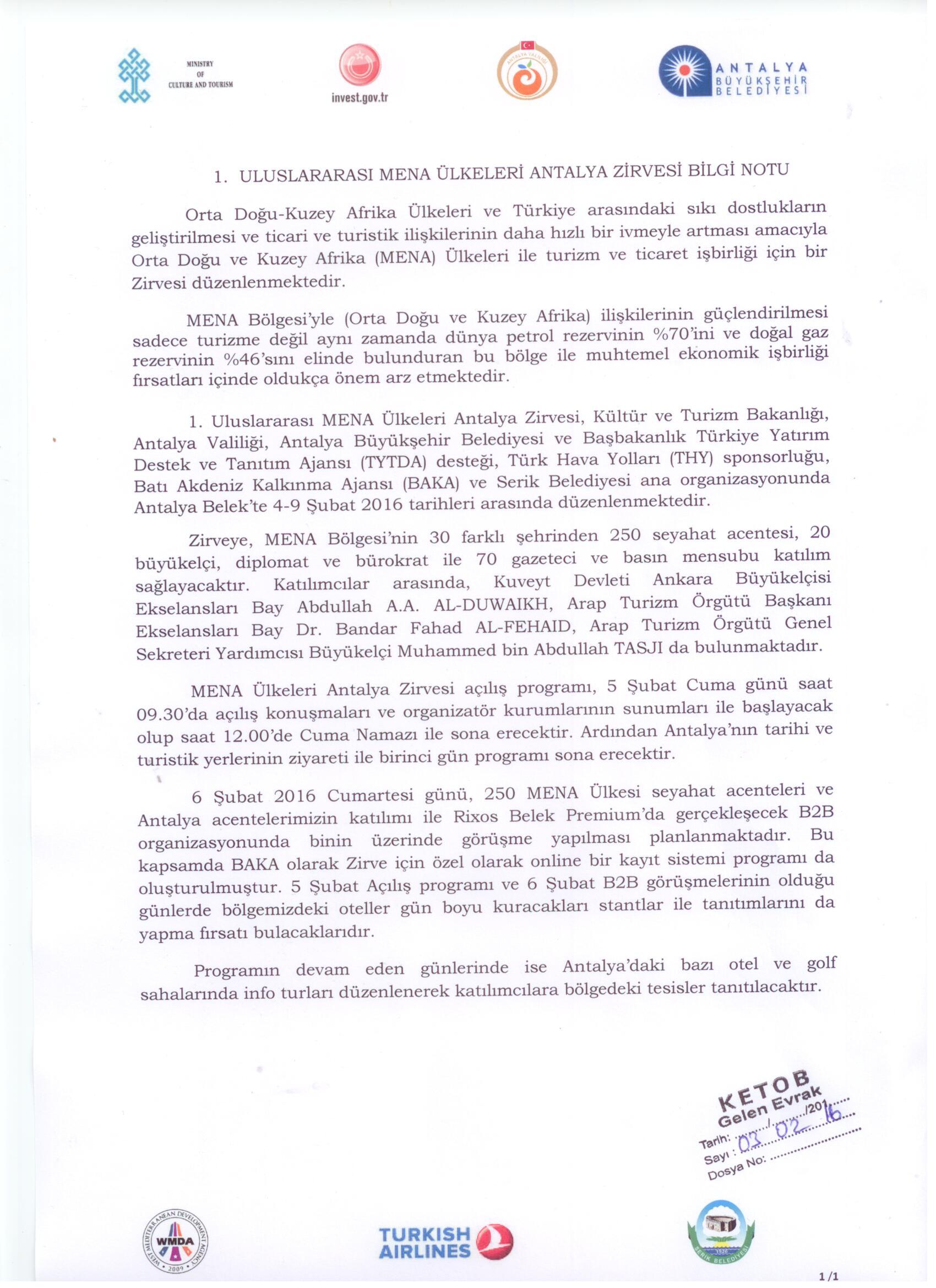 Bu sebeple Antalya Valiliği, Antalya Büyükşehir Belediyesi, Batı Akdeniz Kalkınma Ajansı (BAKA), Kültür ve Turizm Bakanlığı, Türk Hava Yolları (THY), Başbakanlık Tanıtma Fonu  ve Başbakanlık Türkiye Yatırım Destek ve Tanıtım Ajansı (TYDTA) işbirliğinde 4-9 Şubat 2016 tarihlerinde ‘1. Uluslararası MENA Ülkeleri Antalya Zirvesi’ yapılacaktır.