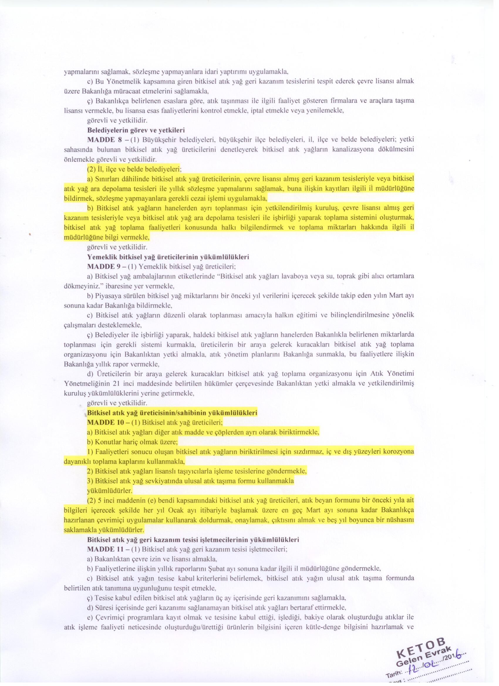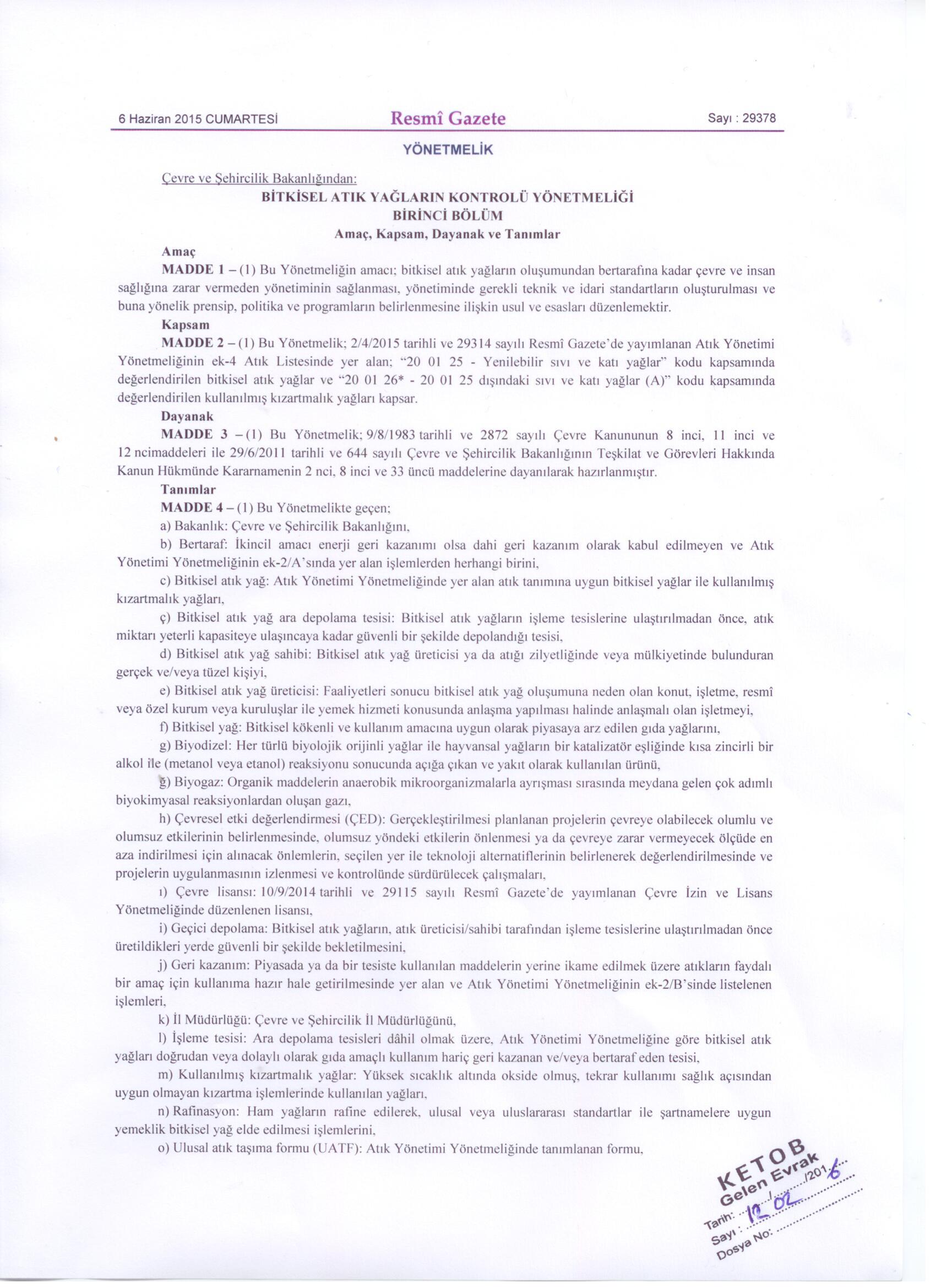 T.C. Çevre ve Şehircilik  Bakanlığı 2872 sayılı Çevre Kanunu ve 6 haziran 2015 tarihli, 29378 sayılı resmi gazetede yayınlanarak yürürlüğe girmiş olan  “ Bitkisel Atık Yağların Kontrolü Yönetmeliği” esaslarına uygun olarak insan ve çevre sağlığına zarar vermeyecek şekilde atık yönetiminin sağlanması amacı ile Bitkisel Atık Yağ Üreticilerinin Atık Yağlarını yönetmelikte de göreceğiniz gibi Sadece Biodizel ve Biogaz Üretimi Yapan ve bu konuda evrak donanımı tam olan Bitkisel Atık Yağ firmalarına Atık Yağlarını vermekle müteselsilen sorumlu ilan etmiştir.