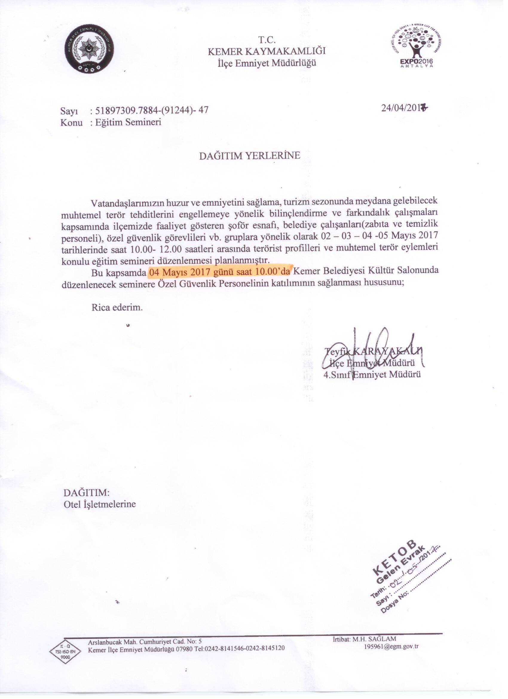 Kemer Turistik Otelciler ve İşletmeciler Birliği (KETOB) ve Kemer İlçe Emniyet Müdürlüğü işbirliği ile Özel Güvenlik Görevlilerine Yönelik eğitim programının, başvuru ve bilgilendirme duyuru yazısı aşağıda bilgilerinize sunulmuştur.