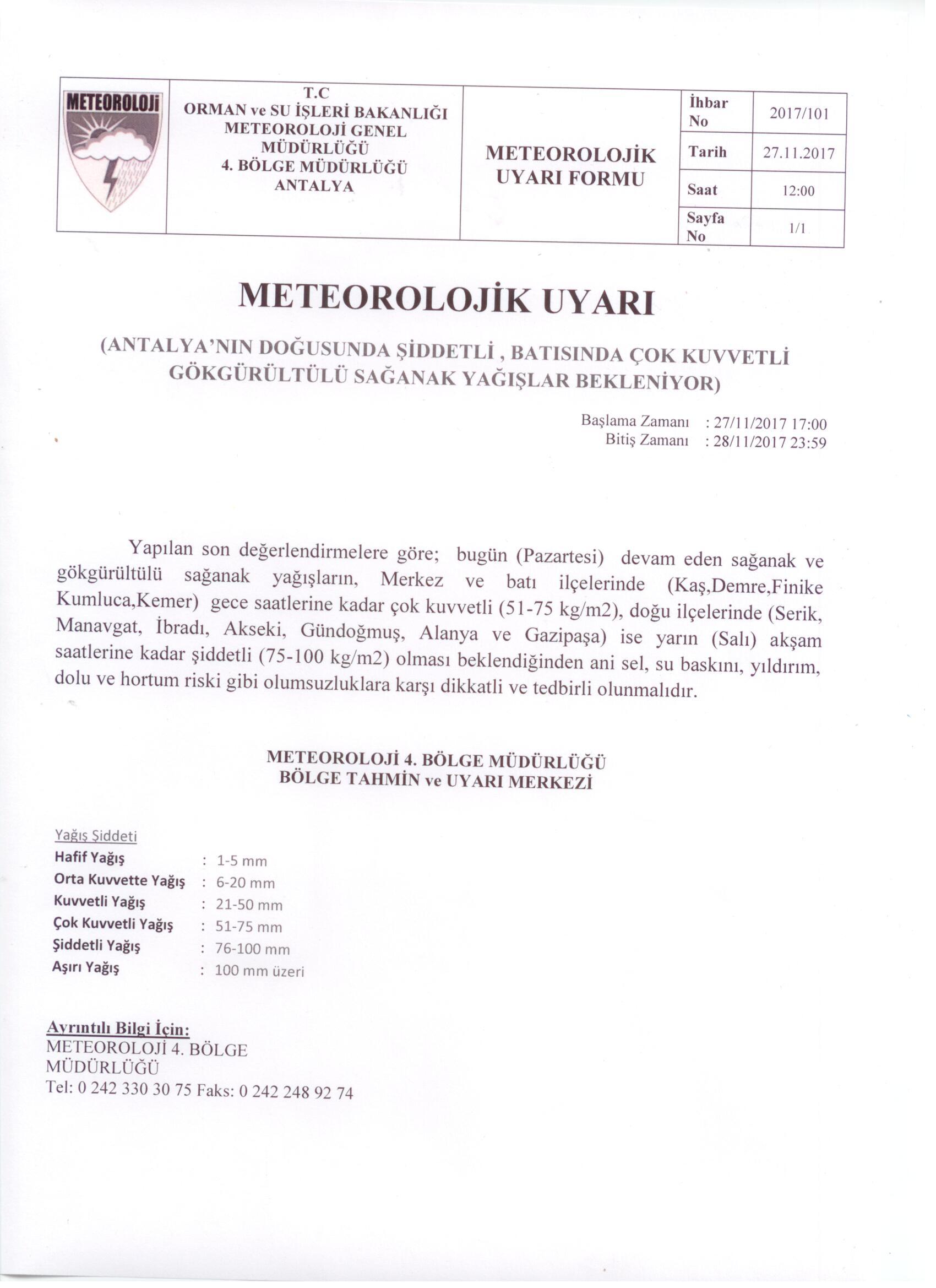 Meteoroloji Genel Müdürlüğü tarafından birliğimize üyelerimizle paylaşılmak üzere gönderilen"Meteorolojik Uyarı Raporunu" aşağıda bilginize sunulmuştur.