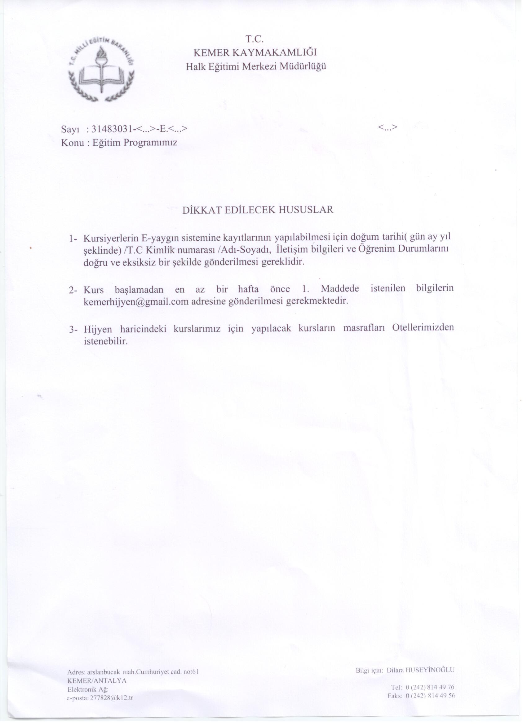 Kemer Halk Eğitim Müdürlüğü tarafından birliğimize üyelerimizle paylaşılmak üzere gönderilen eğitim programı duyurusu aşağıda bilginize sunulmuştur.