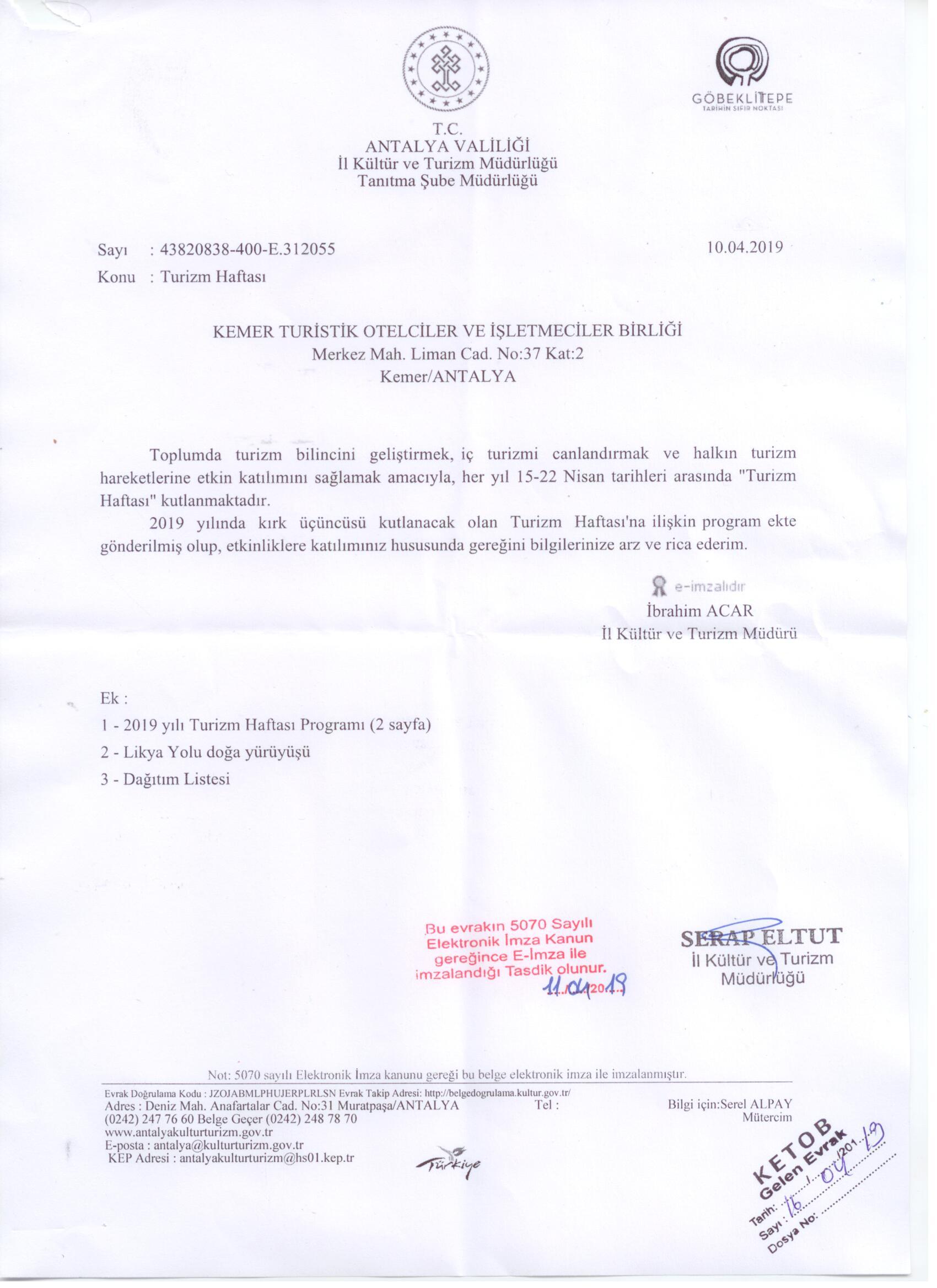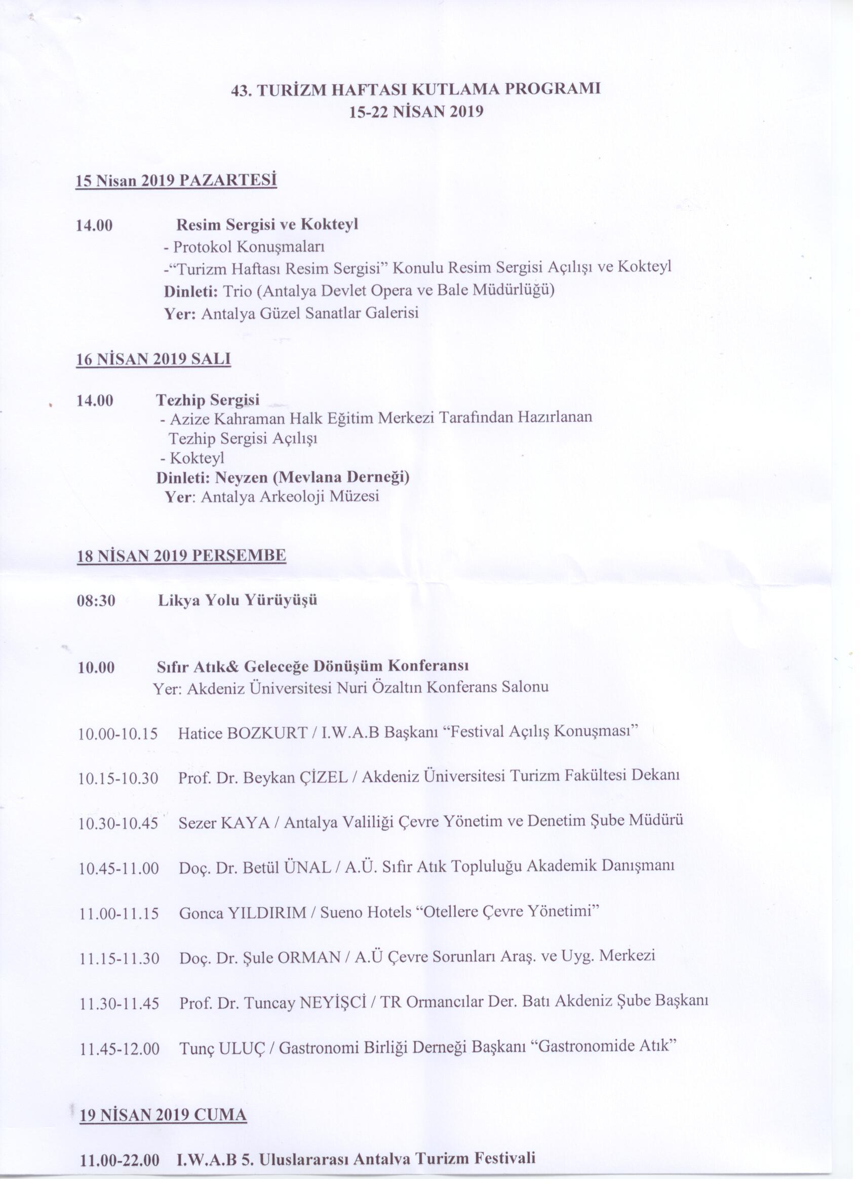 Antalya Valiliği Kültür ve Turizm İl Müdürlüğü tarafından birliğimize siz değerli üyelerimizle paylaşılmak üzere gönderilen "15-22 Nisan 2019 Turizm Haftası" kapsamında ki etkinlik program detayı aşağıda bilginize sunulmuştur.