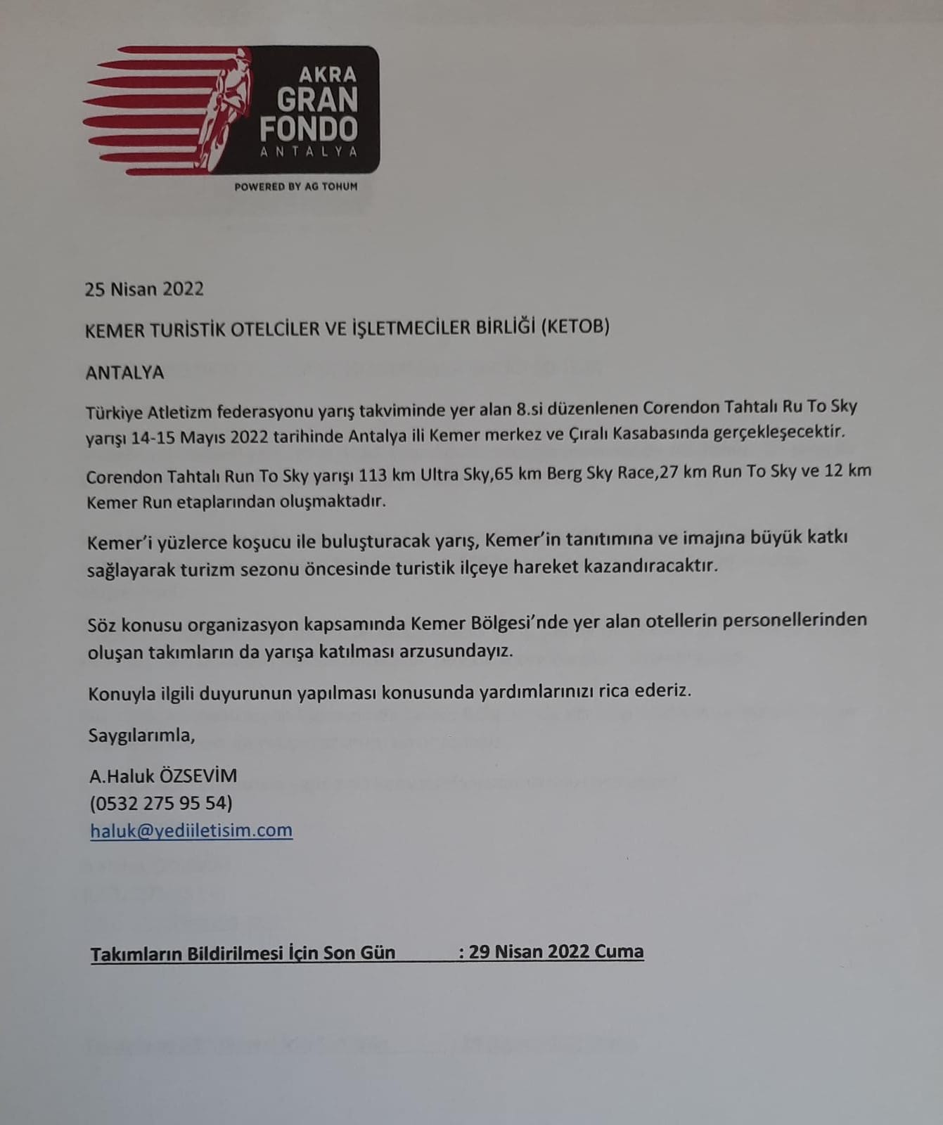 ilçemizde bu yıl 8.si düzenlenecek olan, Corendon Tahtalı Ru To Sky yarışına başvuru detayları aşağıda bilginize sunulmuştur.