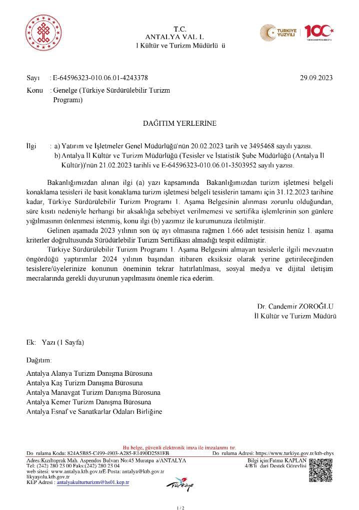 Antalya Turizm İl Müdürlüğü tarafından üyelerimize duyurulması amacıyla tarafımıza gönderilen,