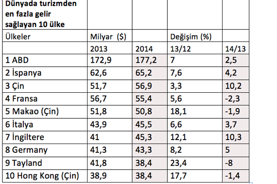 Turizm Yazarları ve Gazetecileri Derneği (TUYED) Başkanı Kerem Köfteoğlu'nun UNWTO uzmanlarının hazırladığı- tablolar üzerinden yaptığı incelemeye göre, Çin, 2014'te 177,2 milyar dolarla listede birinci sırada bulunan ABD'nin ardında ikinci sıraya oturmuş oluyor.