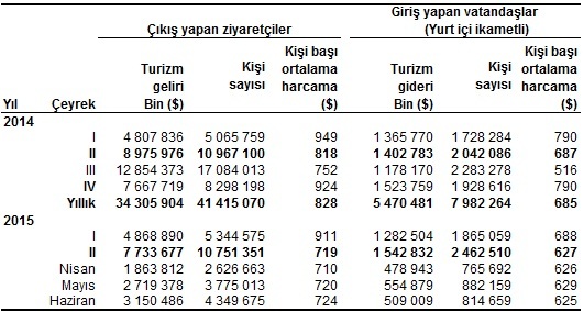 Ülkemizden çıkış yapan ziyaretçi sayısı 2015 yılı II. çeyreğinde bir önceki yılın aynı çeyreğine göre %2 azalarak 10 milyon 751 bin 351 kişi oldu. Bunların %89,6’sını (9 milyon 637 bin 458 kişi) yabancılar, %10,4’ünü (1 milyon 113 bin 893 kişi) ise yurt dışında ikamet eden vatandaşlar oluşturdu.