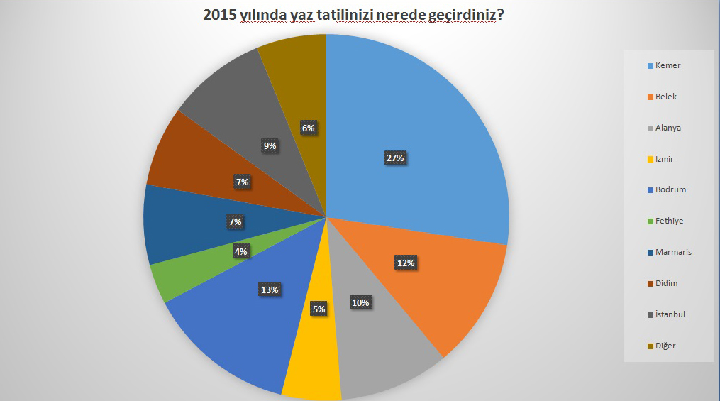 500 kişiden yüzde 27’si Kemer, yüzde 13 Bodrum, yüzde 12 Belek, yüzde 10 Alanya, yüzde 9 İstanbul, yüzde 7 Marmaris, yüzde 7 Didim, yüzde 5 İzmir, yüzde 4 Fethiye olurken yüzde 6’lık kısım ise diğer il ve ilçeleri tercih ettiler.