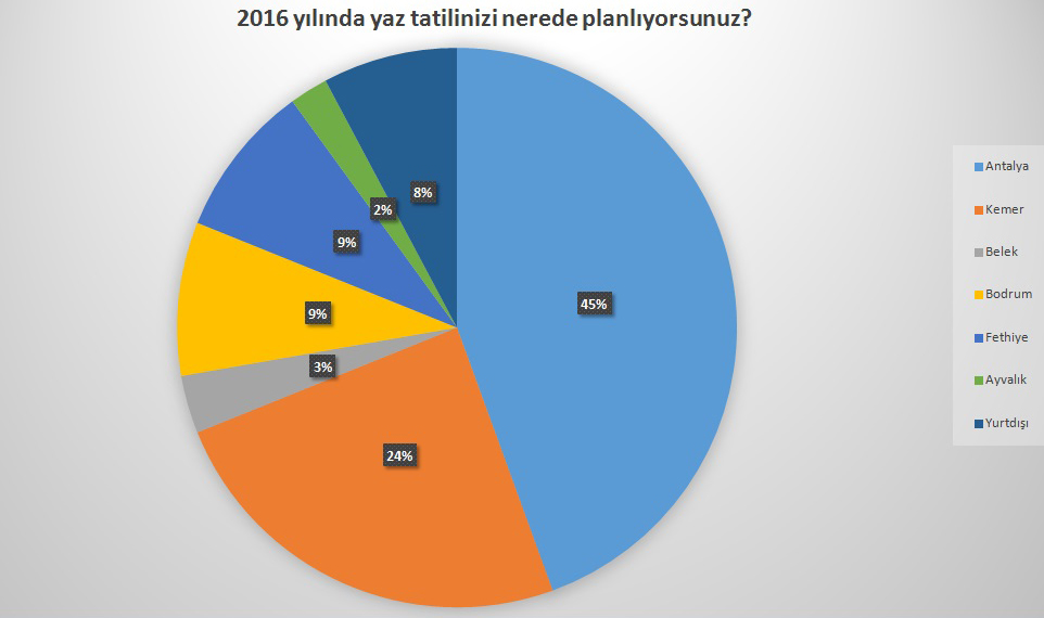 Ankete katılanlar bu soruya ise yüzde 45’lik oranda Antalya’yı seçerken, yüzde 24 Kemer ilçesini, yüzde 9 Fethiye, yüzde 9 Bodrum, yüzde 8 yurtdışı, yüzde 3 Belek bölgesini ve yüzde 2’lik kısım ise Ayvalık’ı tercih edeceklerini belirtti.
