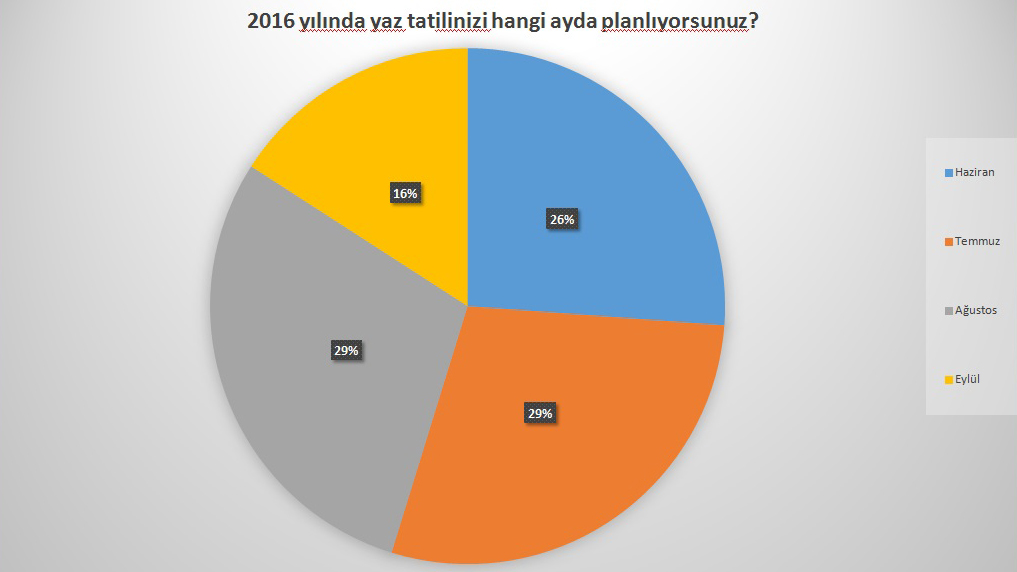 Bu soruya ise ankete katılanlar, yüzde 29 oranında Temmuz ve Ağustos aylarında tatile çıkmayı planlarken, yüzde 26’sı Haziran ayında ve yüzde 16 Eylül ayında tatile çıkmayı planlıyor.