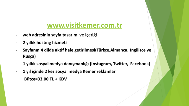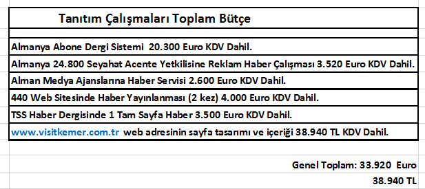 Kemer Turistik Otelciler ve işletmeciler Birliği(KETOB) ve Kemer Belediyesi ortak çağrısıyla, 2016 yılında öngörülen krizin bölgemize olan etkilerini minimize etmek amacıyla aldığımız ortak kararlar doğrultusunda, Alman Pazarında Kemer Reklam Kampanyasına yönelik tanıtım çalışmalarının detayları ile Kemer'in İnteraktif ortamda tanıtımı için yapılan çalışmaların bütçeleri, bu çalışmalar için bağış yapan otellerimiz ve toplanan bağış miktarı aşağıda ki sunumda bilgilerinize sunulmuştur.