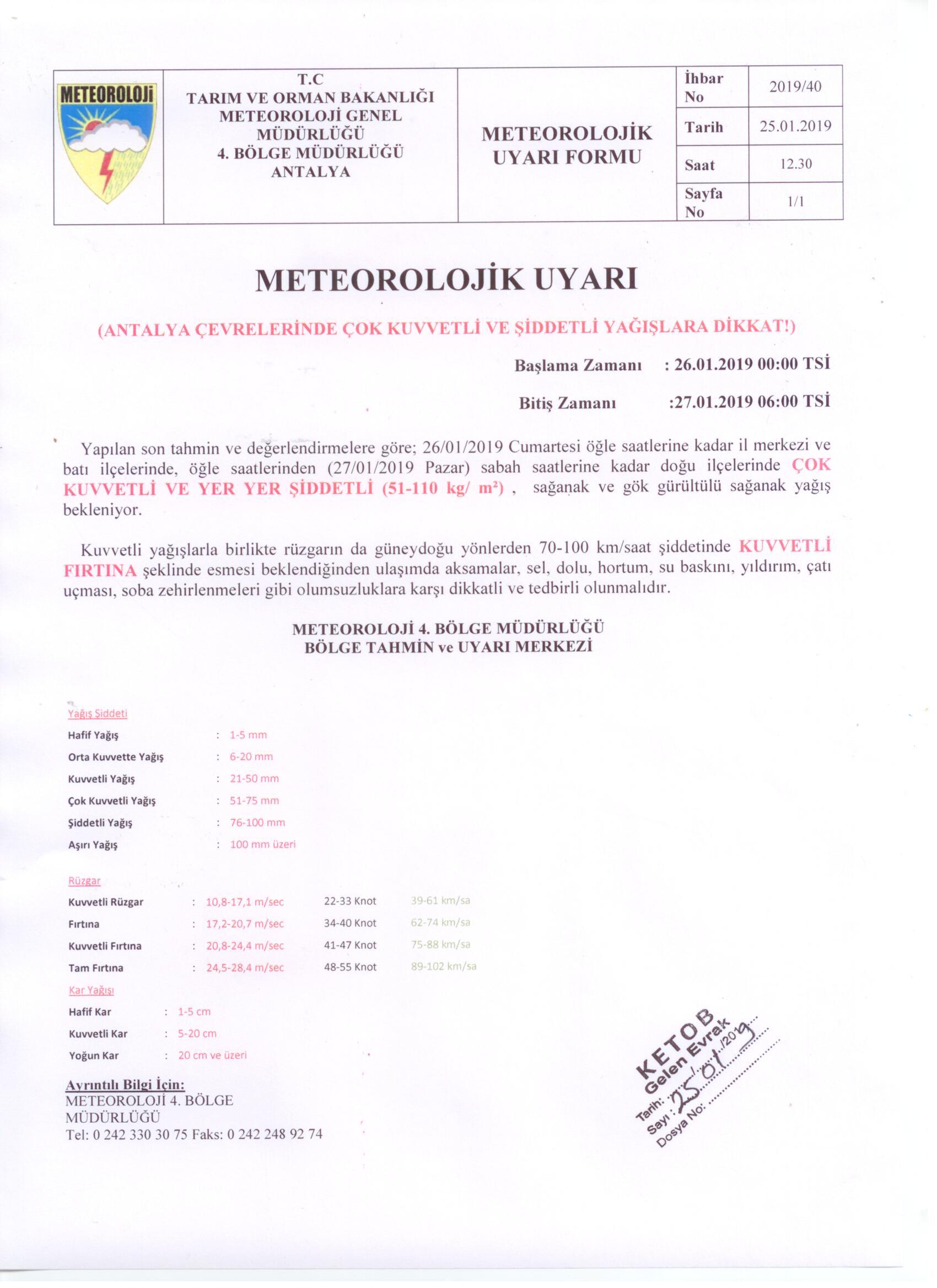 Meteoroloji Genel Müdürlüğü tarafından birliğimize üyelerimizle paylaşılmak üzere gönderilen"Meteorolojik Uyarı Raporu" aşağıda bilginize sunulmuştur.